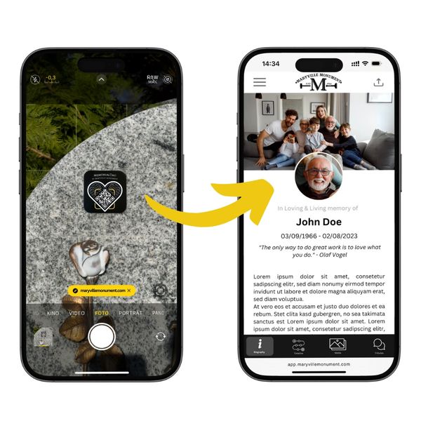 MemorialTag is a QR code linking to a profile on our memorial platform, where you can save photos, videos and the timeline of your loved one.